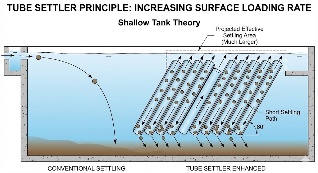 Tube Settlers utilizați o serie de canale hexagonale înclinate pentru a îmbunătăți eficiența de decantare a solidelor într-un clarificator. Prin creșterea zonei efective de decantare (pe baza Legea Hazens sau teoria rezervoarelor superficiale ), aceste module permit particulelor să cadă la o distanță foarte scurtă înainte de a lovi peretele tubului și de a aluneca în jos.
