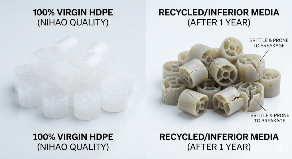 100% Virgin HDPE (Polietilena de înaltă densitate) este preferată deoarece oferă rezistență mecanică superioară, rezistență chimică și densitatea corectă (0,95-0,97 g/cm3) pentru fluidizare. Materialele reciclate conțin adesea impurități care fac mediul fragil sau îl fac să se scufunde, ducând la defecțiunea sistemului în 2-3 ani.